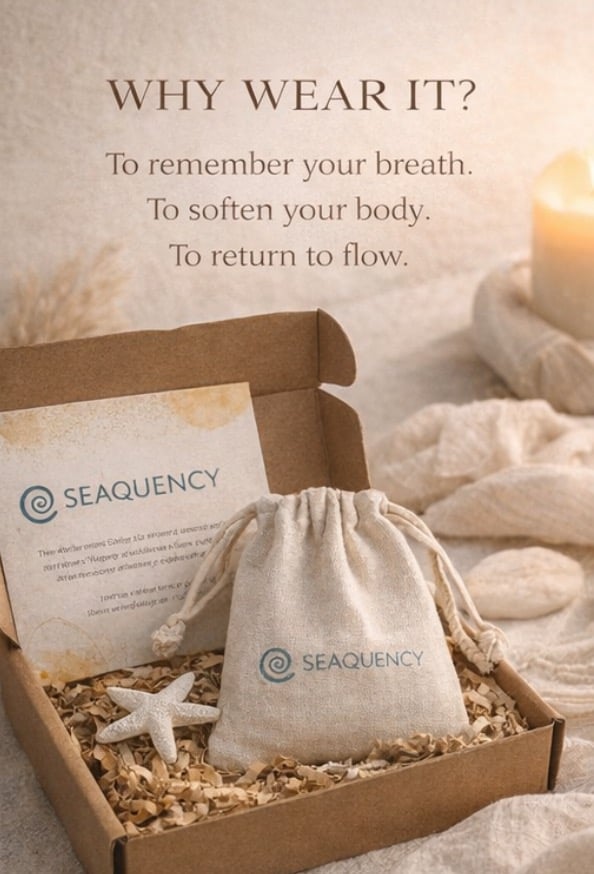 Water doesn’t rush, yet it transforms everything it touches. Seaquency is inspired by the ocean’s natural frequency — a reminder that the body already knows how to release tension, when we allow it to slow down. Worn close to the heart as a mindful reminder to breath.